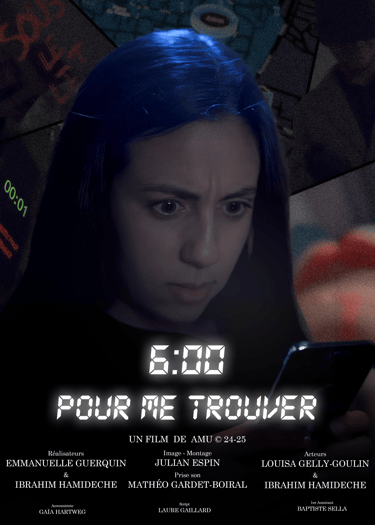 Une adolescente est réveillée en pleine nuit par une alarme qu’elle n’a jamais programmée. Des événements étranges s’enchaînent : un objet qui se brise seul, un compte à rebours inquiétant s’affiche sur son téléphone : «6 minutes pour me trouver». À travers des indices laissés dans sa chambre, elle tente de comprendre… mais la peur grandit. Lorsqu’elle découvre des photos compromettantes envoyées sur son téléphone, il est déjà trop tard. Une présence surgit derrière elle et l’assomme.